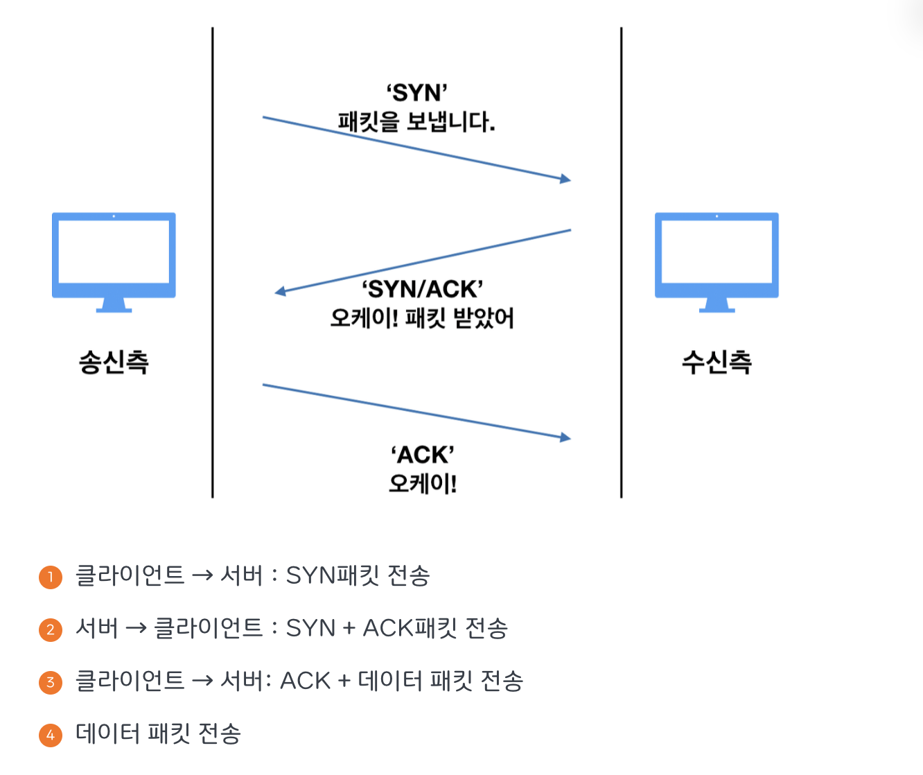 - 본격적인 데이터 통신 전에 가상 연결 및 패킷을 보내서 확인하는 동작