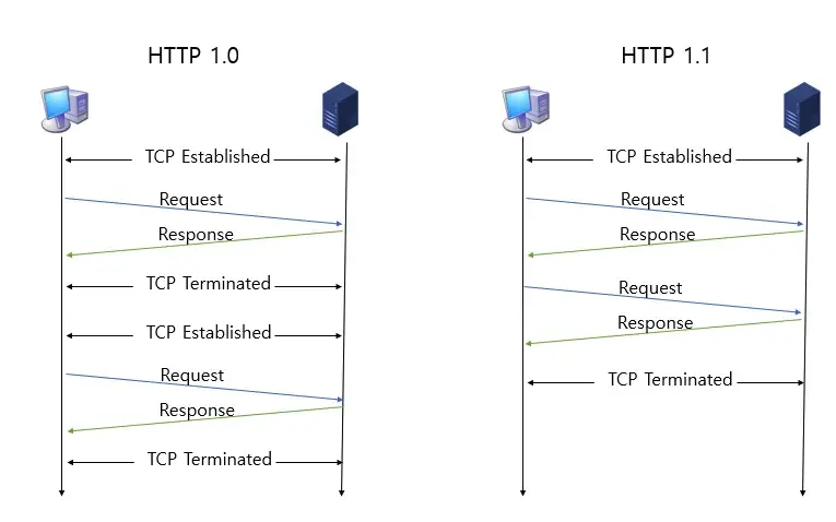 - 즉, HTTP 1.0은 매번 데이터를 요청하고 수신할 때마다 TCP 세션을 맺지만, HTTP 1.1은 한 번의 TCP 세션에 여러 개의 요청을 보내고 응답을 수신할 수 있다