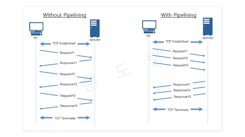 - 파이프라이닝 기능이 없는 경우에는 요청 1,2,3 이 있으면 요청1 -> 응답1 -> 요청2 -> 응답2 -> 요청3 -> 응답3 순서로 진행되며, 응답 1이 없는 경우에는 요청2, 요청3은 진행되지 않는다