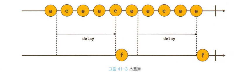 - 즉, 스로틀은 짧은 시간 간격으로 연속해서 발생하는 이벤트를 그룹화해서 일정 시간 단위로 이벤트 핸들러가 호출되도록 호출 주기를 만든다.