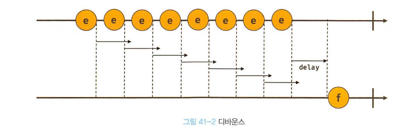 - 디바운스 : 짧은 시간 간격으로 이벤트가 연속해서 발생하면 이벤트 핸들러를 호출하지 않다가, 일정 시간이 경과한 이후에 이벤트 핸들러가 한 번만 호출되게 하는 것.