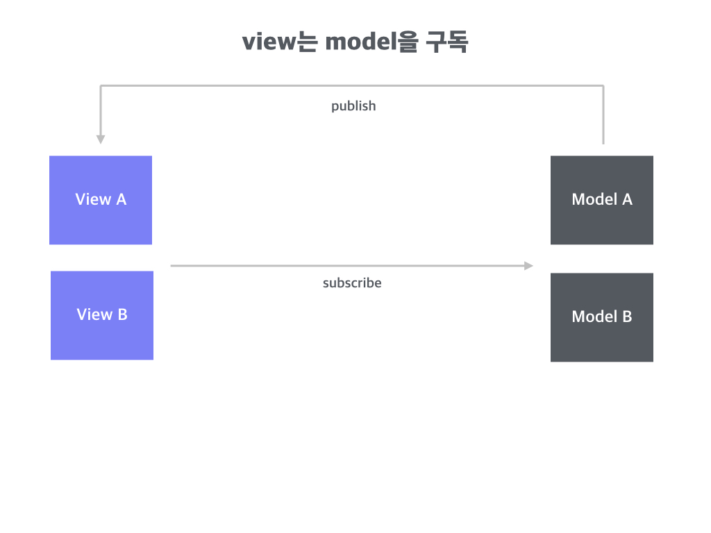 - 옵저버 패턴은 간단하게 말해 "구독"과 "발행" 개념으로 표현되며 View는 Model을 구독하고 Model의 상태가 변경되면, 이를 구독하고 있는 View의 렌더링 함수(혹은 등록해놓은 함수)가 실행된다.