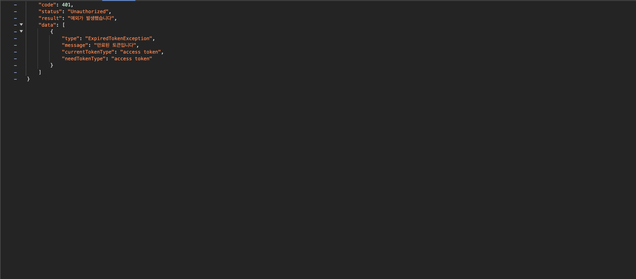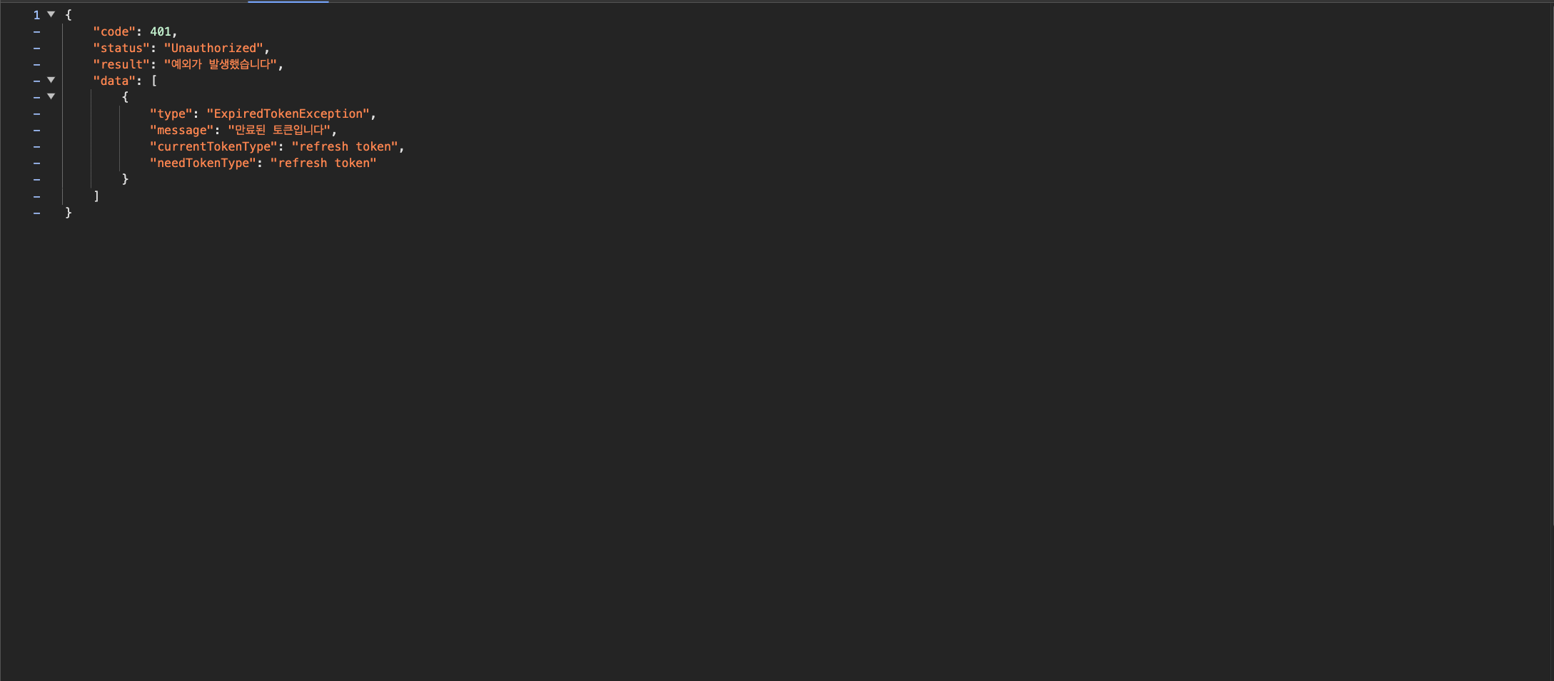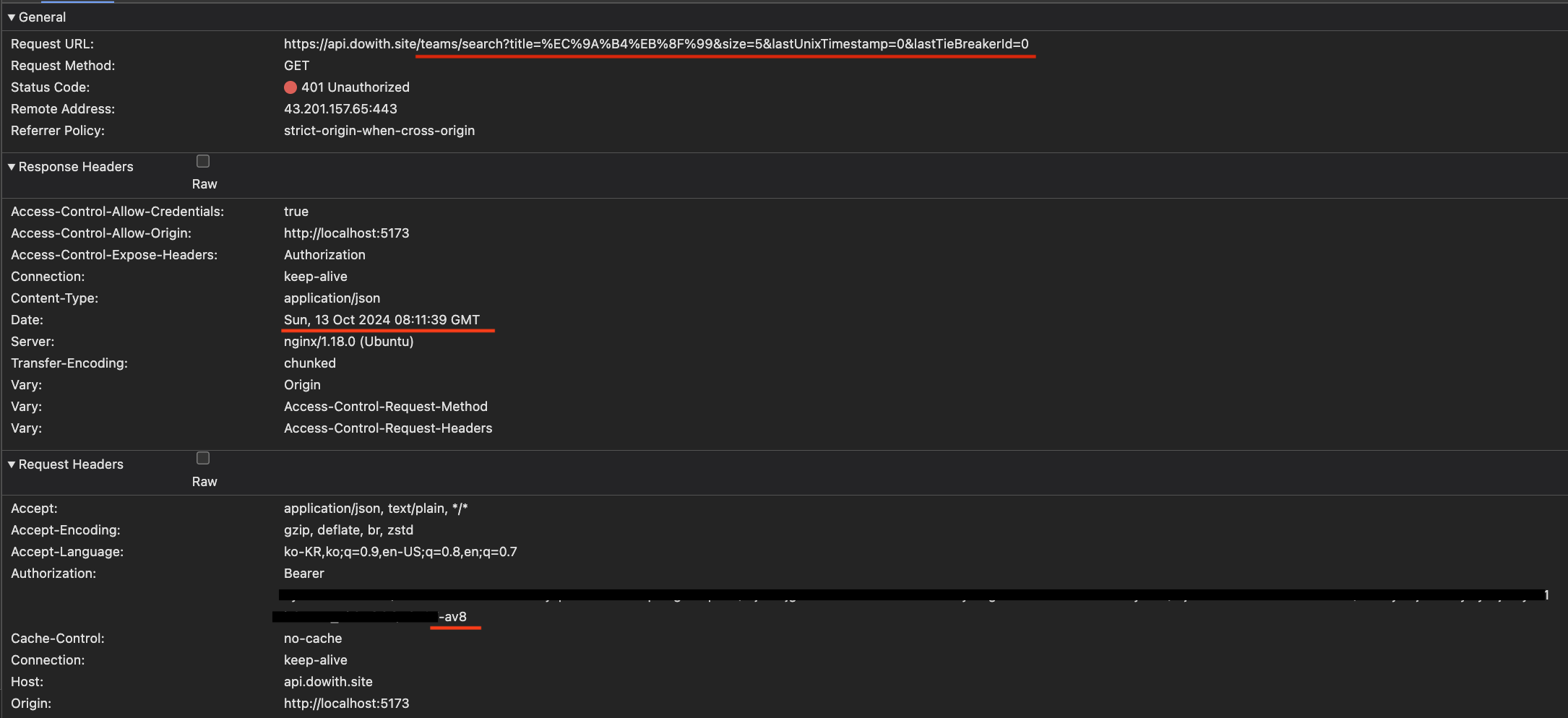 - 테스트를 위해 access token의 유효기간을 1분으로 해두었기 때문에, 최초 로그인 시에 발급되었던 "-av8"로 끝나는 access token은 위 요청이 발생한 08:11:39 에는 만료가 되었고, 401 에러가 발생하는 것을 볼 수 있다.