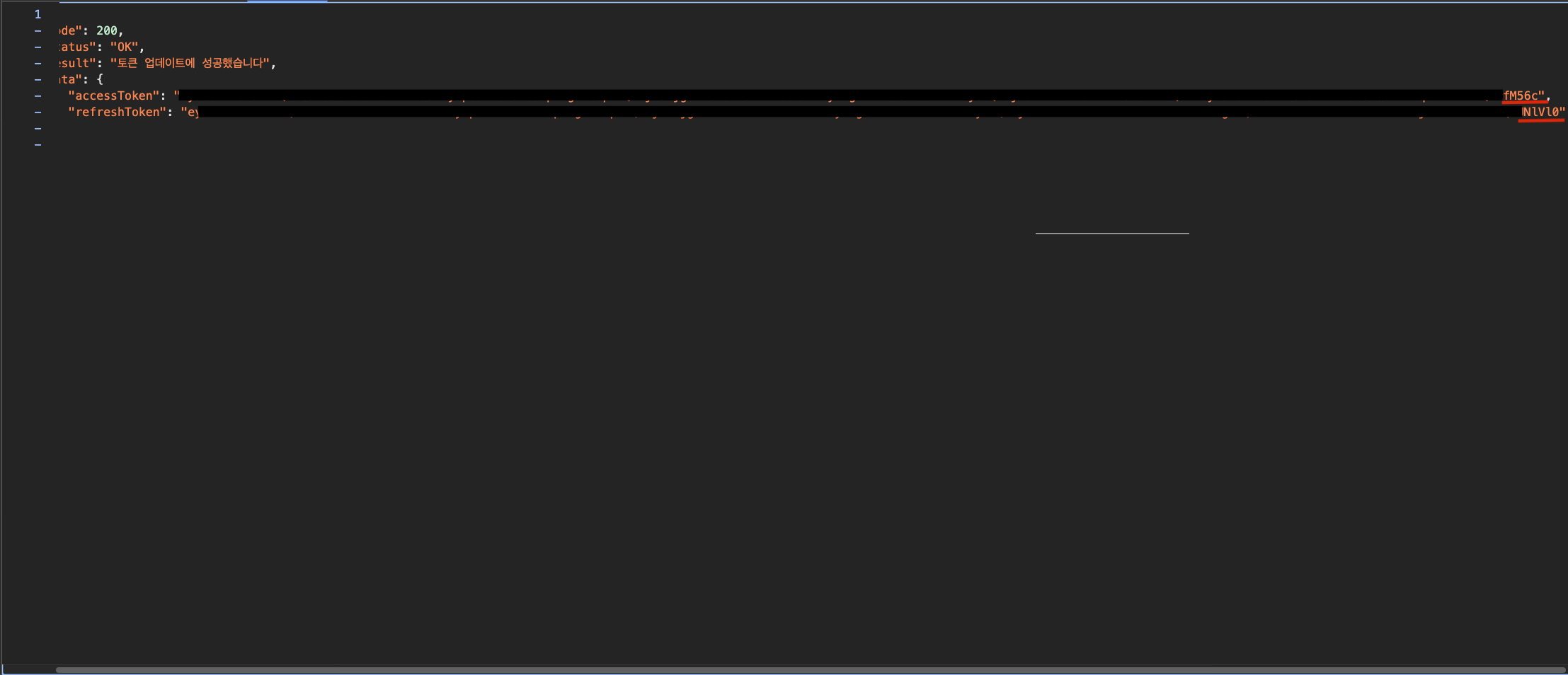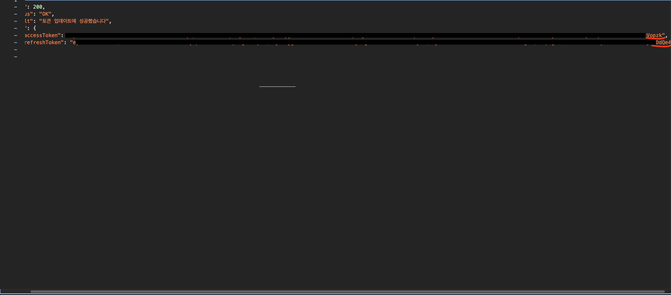 - "opzk"로 끝나는 access token이 만료되어 "M56c"로 끝나는 access token과 "lVl0"으로 끝나는 refresh token을 새롭게 발급받는 모습이다.