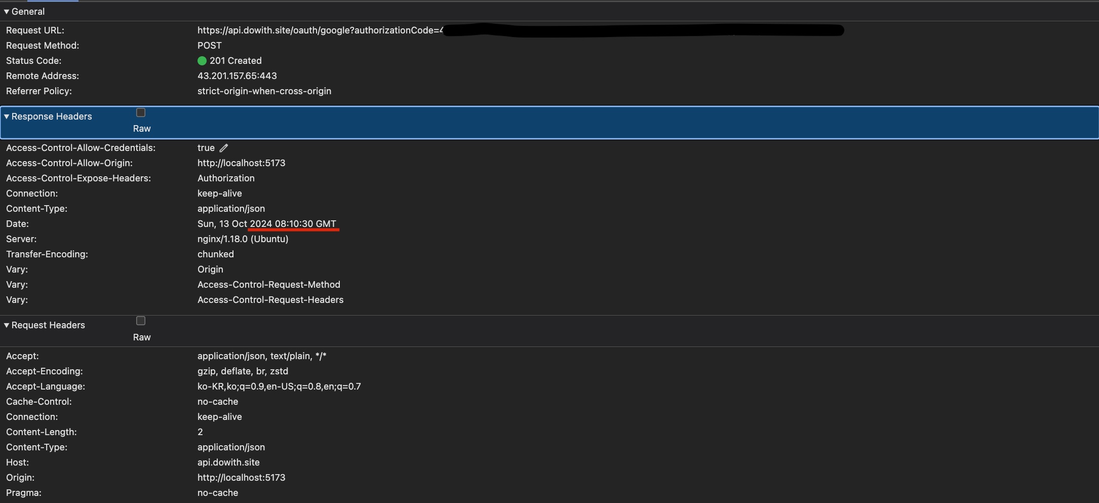 - 다음은, 401 에러가 발생했기 때문에 axios interceptors를 활용하여 최초 로그인시에 발급받고 아직 유효기간이 남아있는 "dr1g"로 끝나는 refresh token을 Request Header에 담아 갱신을 요청하여 "opzk"로 끝나는 access token과 "dQe4"로 끝나는 refresh token을 발급받는 모습이다.