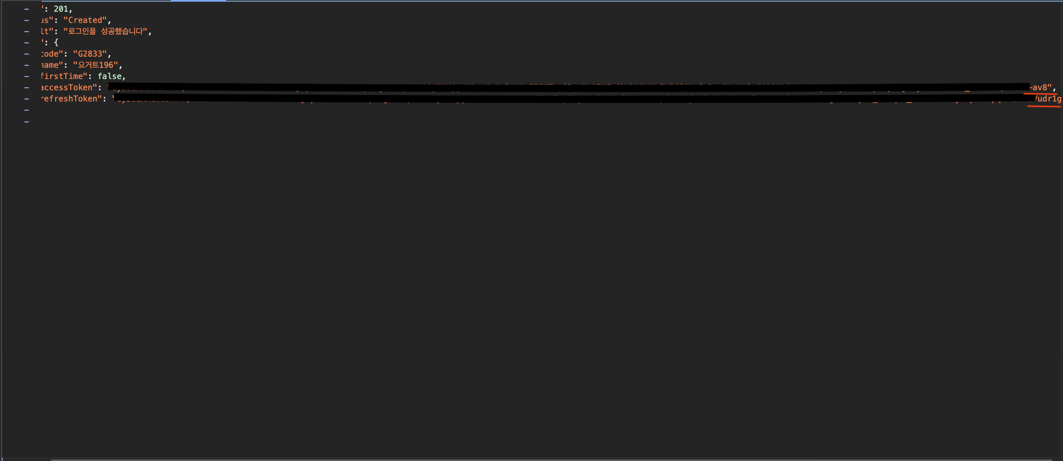 - 먼저 위에 있는 두 개의 이미지는 최초 로그인 시에 access token과 refresh token을 받아오고 있는 이미지이며, access token은 "-av8"로 끝나고 있으며 refresh token은 "dr1g"로 끝나고 있다.