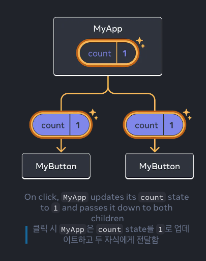 예를들어, 위 그림과 같이 count라는 동일한 state를 각각의 MyButton 컴포넌트에서 표시를 하는 경우, 두 개의 버튼 중에 하나를 클릭하면, MyApp의 count가 변경되고, count를 표시하는 두 개의 MyButton가 모두 변경된다.