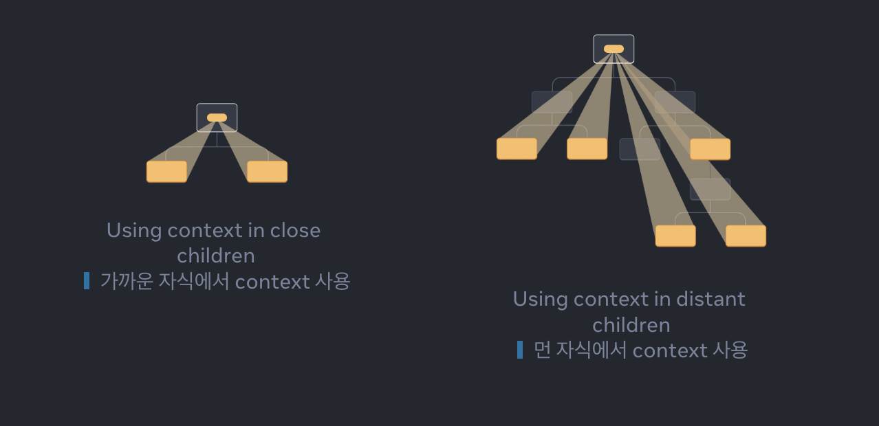 - context를 제공하는 컴포넌트와 context를 사용하는 컴포넌트 사이에 원하는 만큼의 컴포넌트를 삽입할 수 있다.