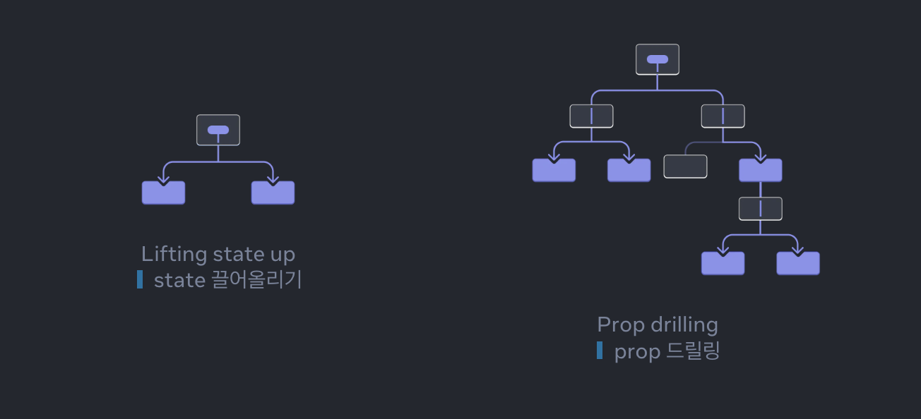 - 하지만, 가장 가까운 공통 조상이 데이터가 필요한 컴포넌트에서 멀리 떨어져 있을 수 있으며, state를 높이 끓어올리면 "prop drilling"이 발생할 수 있다.