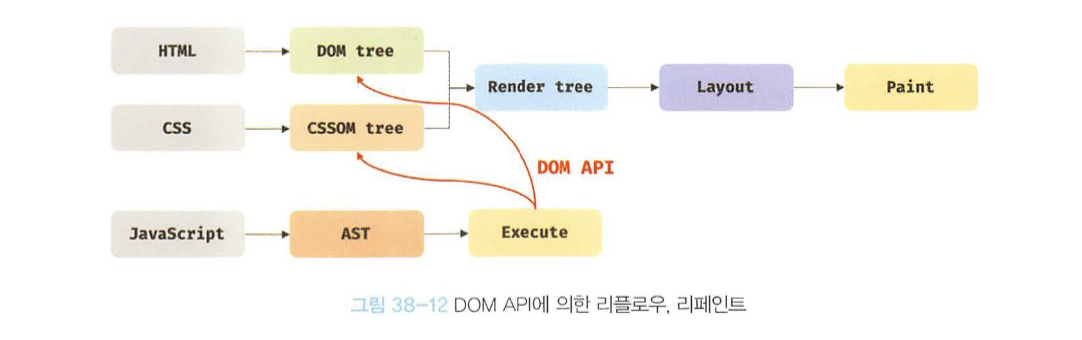 - 자바스크립트 코드에 DOM이나 CSSOM을 변경하는 DOM API가 사용되면 DOM이나 CSSOM이 변경되고, 변경된 DOM과 CSSOM은 다시 렌더 트리로 결합되고 변경된 렌더 트리 기반으로 레이아웃과 페인트 과정을 거쳐 브라우저 화면에 다시 렌더링된다.
