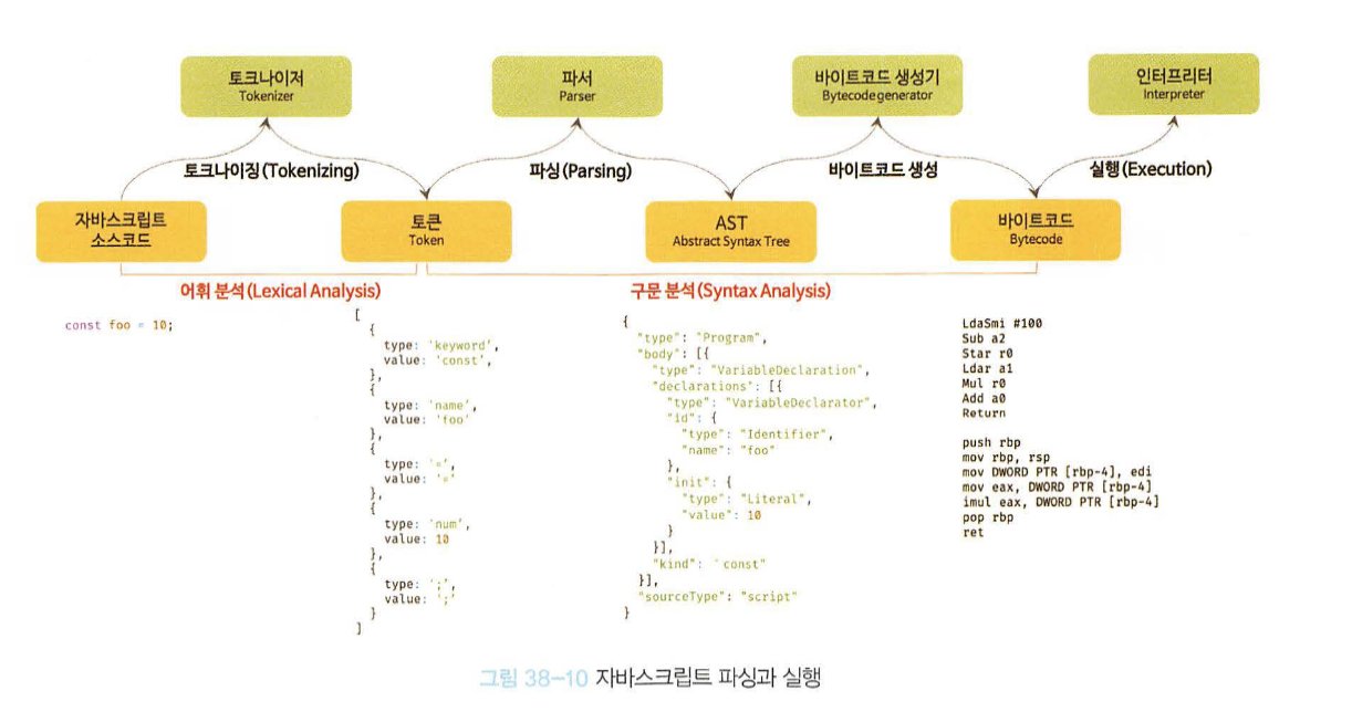 - 자바스크립트 엔진은 자바스크립트를 해석하여 AST(추상적 구문 트리)를 생성하고 이를 기반으로 인터프리터가 실행할 수 있는 중간 코드인 바이트 코드를 생성하여 실행한다.