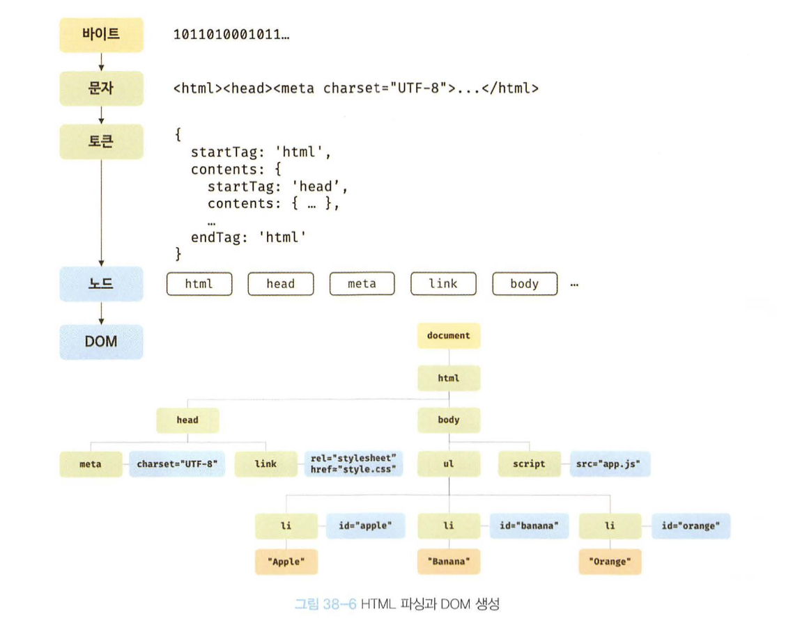 - HTML 파싱과 외부 자바스크립트 파일의 로드가 비동기적으로 동시에 진행된다. 단 자바스크립트의 파싱과 실행은 자바스크립트 파일의 로드가 완료된 직후 진행되며, 이때 HTML 파싱이 중단된다.